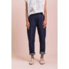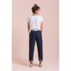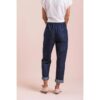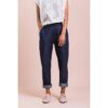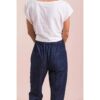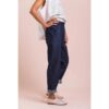 Slouchy jean style denim pant with elastic at back waist. Fake fly and side seam pockets and back jean style patch pockets. Pants have a flat front and loose straight leg. Rolled hem. Fair trade organic cotton 12oz washed denim – heavier weight denim.   Dark original denim colour
